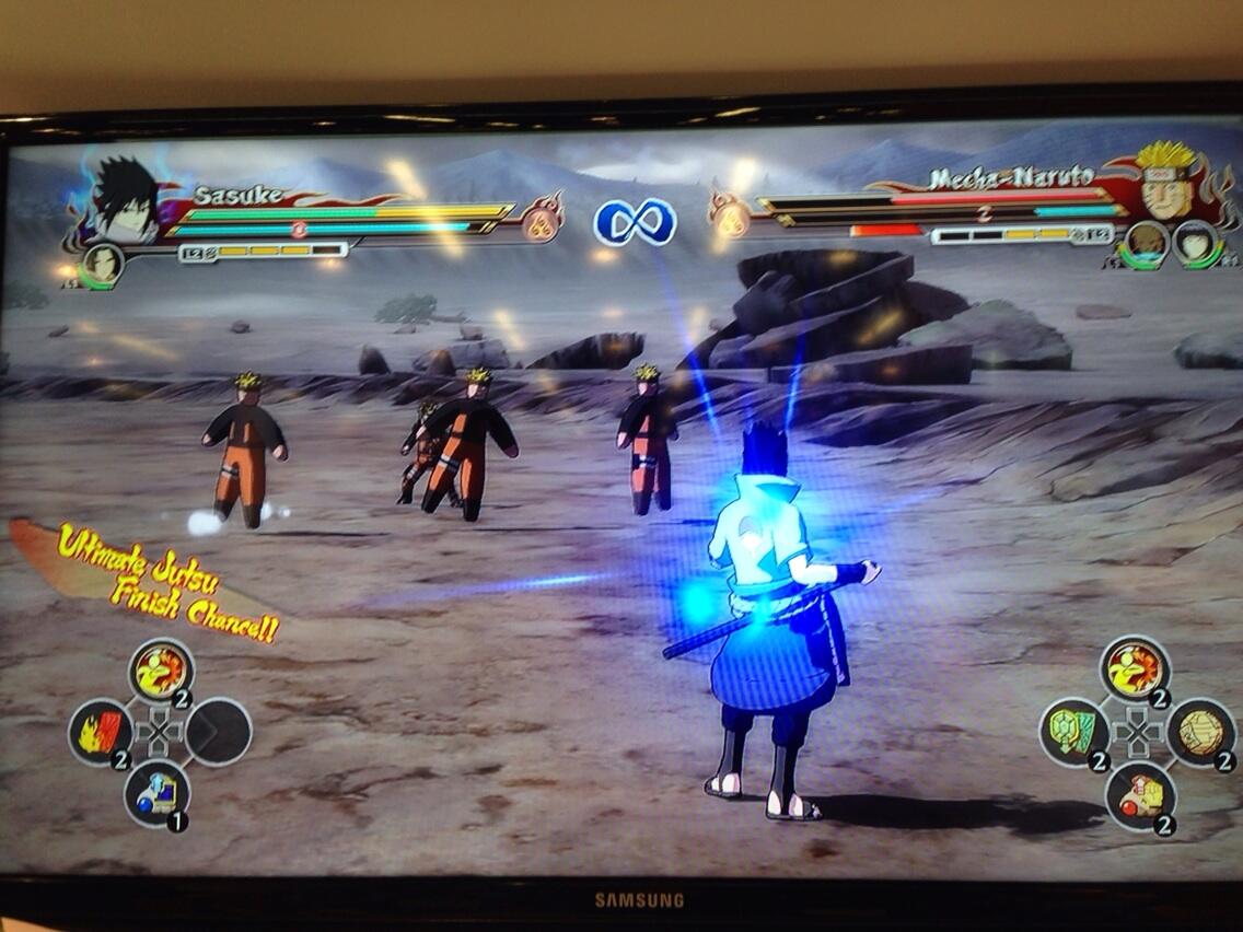 In the following screenshot, it shows Sasuke with Edo Itachi as support and Mecha Naruto with Bijuu Naruto and Hinata as support and are currently in combat.